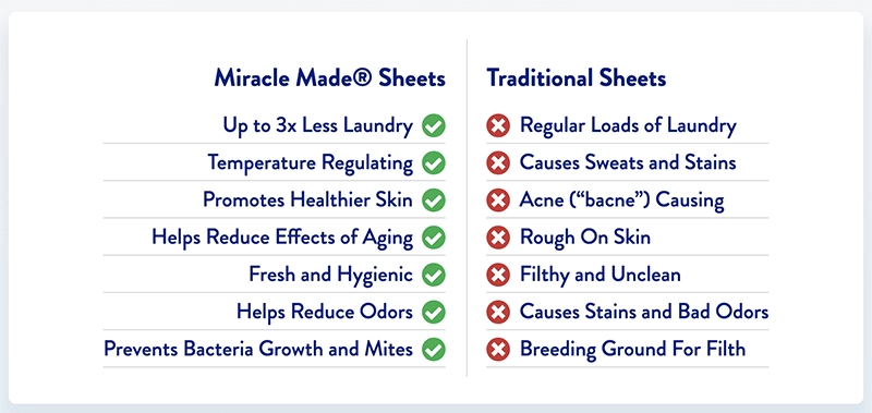 Bed sheets haven’t seen innovation in decades. Your traditional sheets are a breeding ground for all types of bacteria and dust mites. Which is why Miracle Made® has created some of the most hygienic luxury sheets ever. These bed sheets are infused with silver that prevents up to 99.7% of bacteria growth, helping to support healthier skin and cleanliness along with some amazing added benefits!