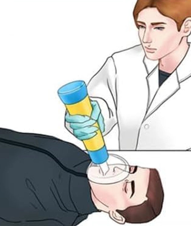 Attach the proper-sized mask to the device and place it over the nose and mouth — create a good seal.