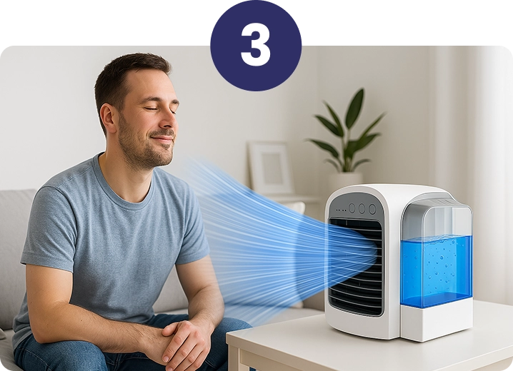 Forget bulky, high-maintenance AC units. Breeze Box is compact, easy to move from room to room, and crafted with durable materials made to last. No tools, no hassle—just fill the water tank, plug it in, and enjoy a refreshing blast of cool air anywhere in your home.